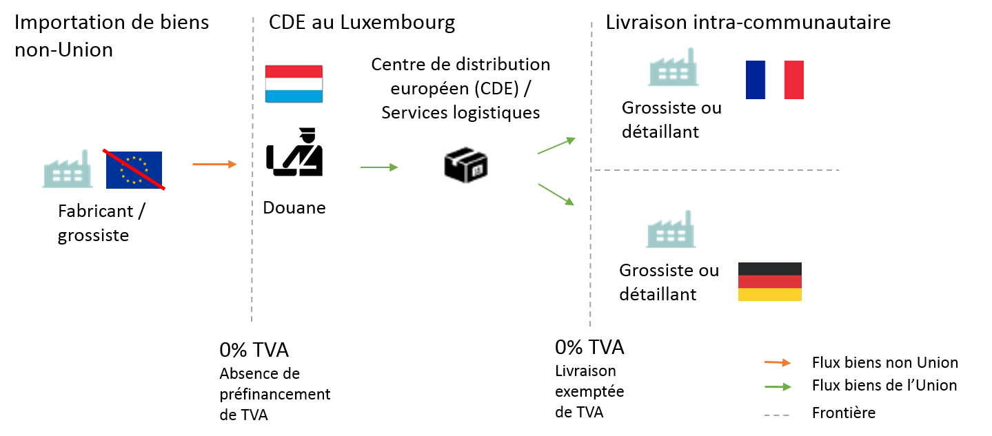 En plus des droits de douane, l'importation de marchandises dans l'Union Européenne (EU) entraîne l'obligation de payer la TVA dans le pays d'importation, à moins que les marchandises ne soient placées dans un entrepôt sous douane. La plupart des pays européens exigent le paiement immédiat de la TVA. La législation évoluée du Luxembourg en matière de TVA a complètement éliminer ce processus. Il n'y a ainsi aucun coût lié au pré-financement de la TVA au Luxembourg. Même si certains pays européens permettent un processus similaire sur demande et selon certaines conditions, le facteur clé de différentiation du Luxembourg comparé à ces pays est sa facilité de mise en oeuvre : automatique et sans conditions.